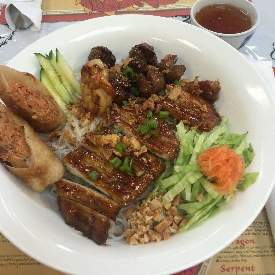 Enjoy a medley of delicate vermicelli, crisp vegetables, grilled chicken, pork, and succulent shrimp, enhanced by a crispy spring roll and zesty fish sauce.