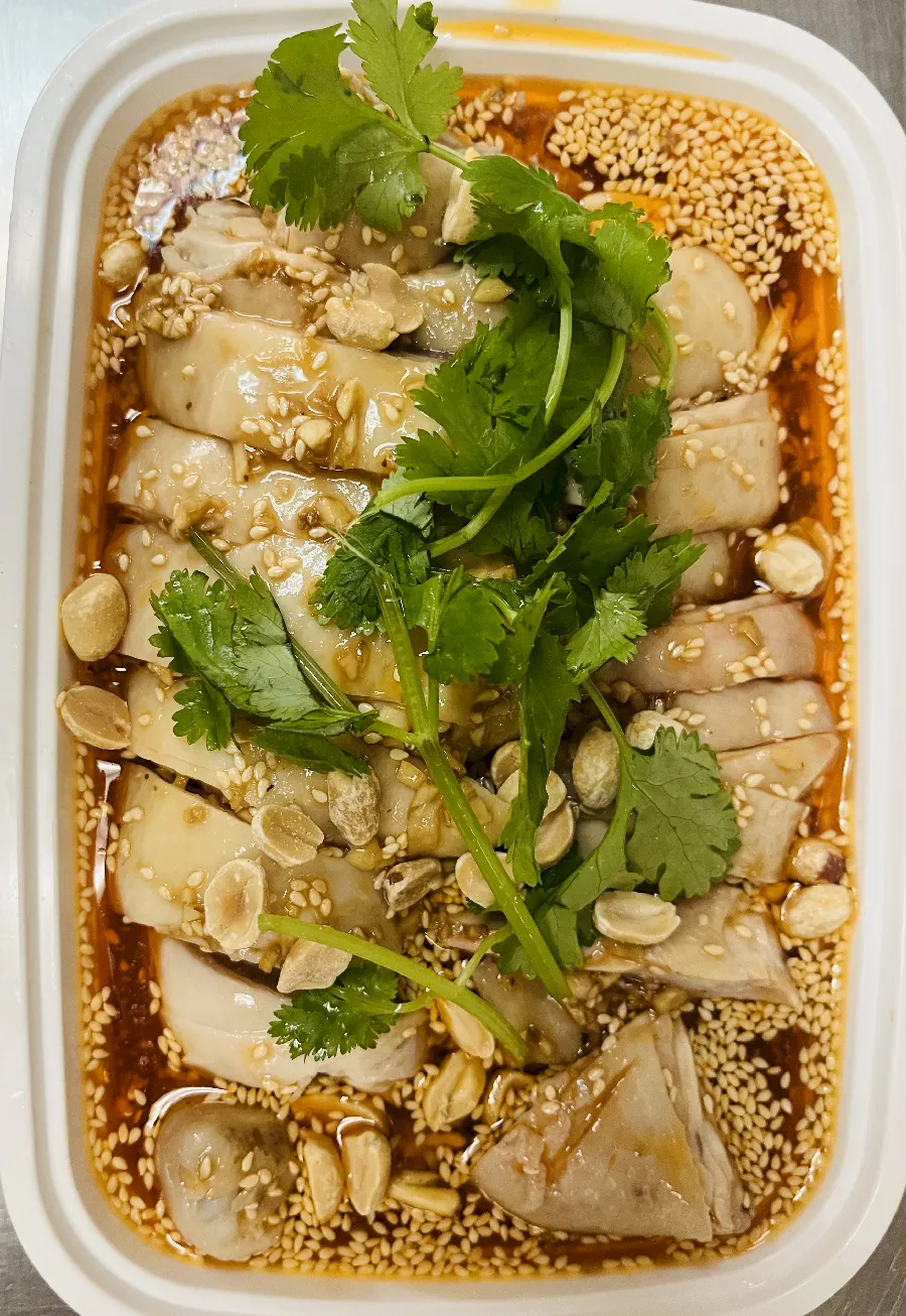Tender, chilled chicken pieces, masterfully poached and drenched in a vibrant, complex Sichuan chili oil, delivering an irresistible spicy and numbing sensation.